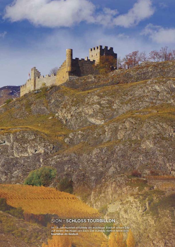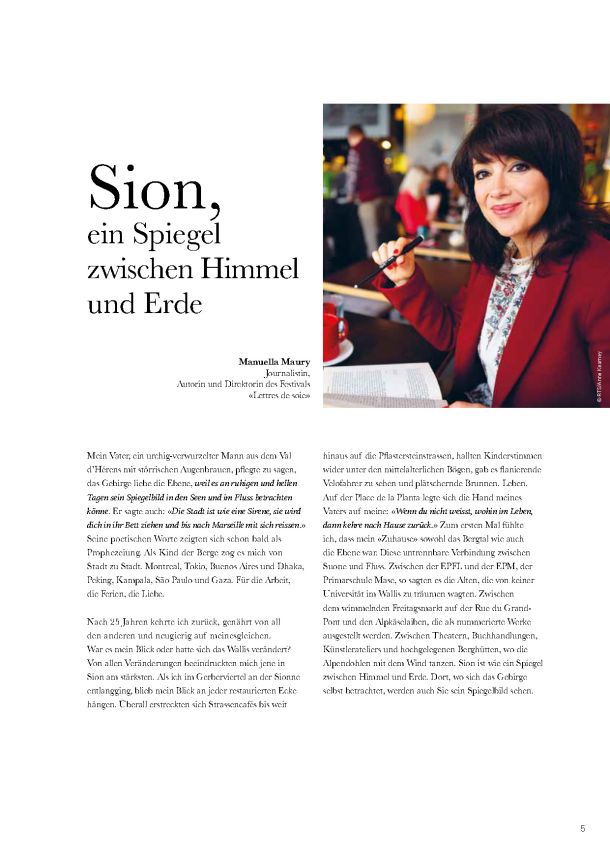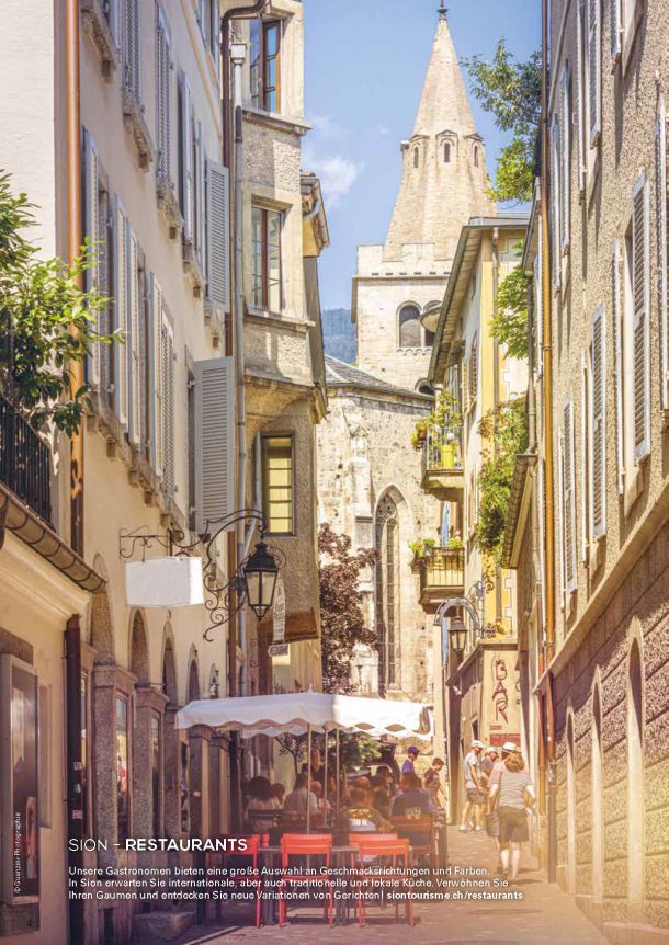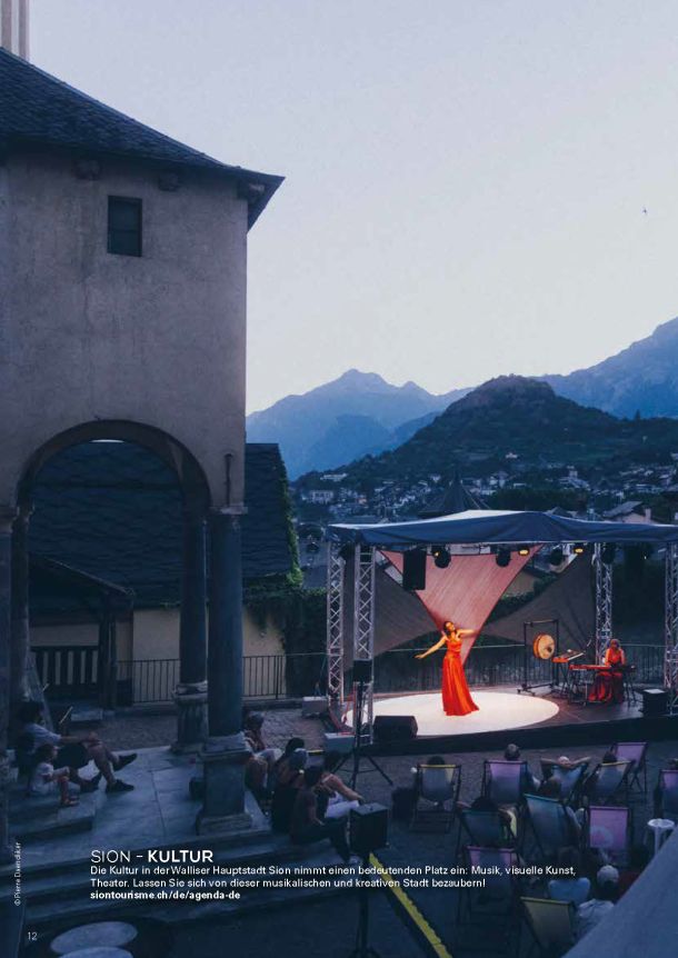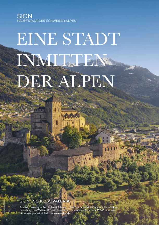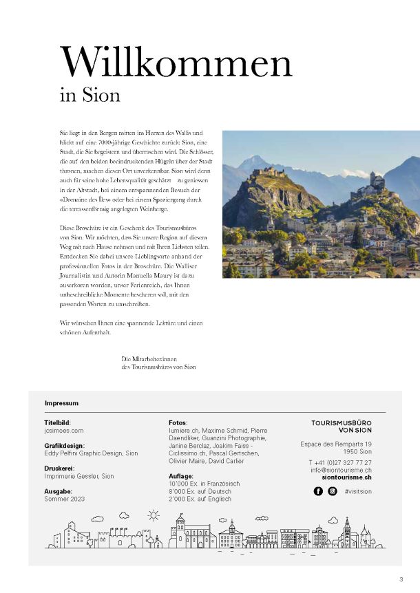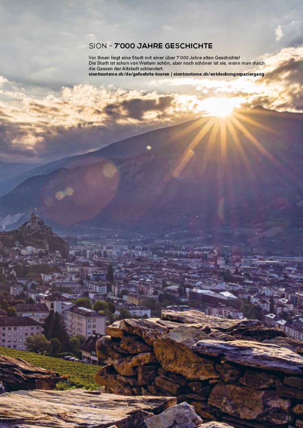 Diese Broschüre ist ein Geschenk des Tourismusbüros von Sion. Wir möchten, dass Sie unsere Region auf diesem Weg mit nach Hause nehmen und mit Ihren Liebsten teilen. Entdecken Sie dabei unsere Lieblingsorte anhand der professionellen Fotos in der Broschüre. Die Walliser Journalistin und Autorin Manuella Maury ist dazu auserkoren worden, unser Ferienreich, das Ihnen unbeschreibliche Momente bescheren soll, mit den passenden Worten zu umschreiben.