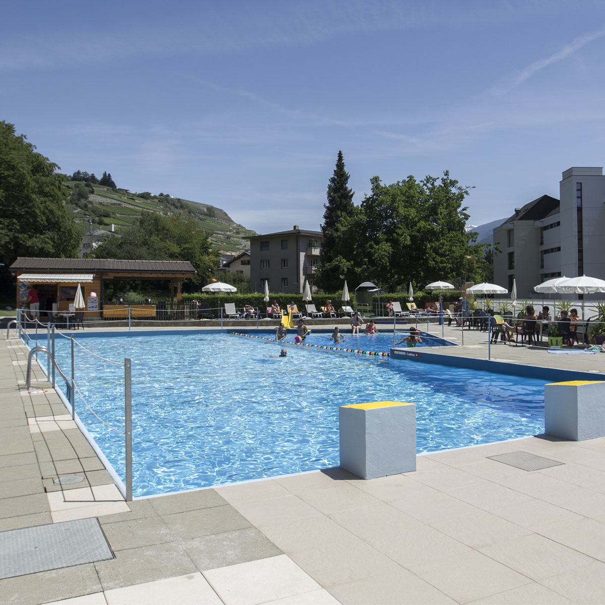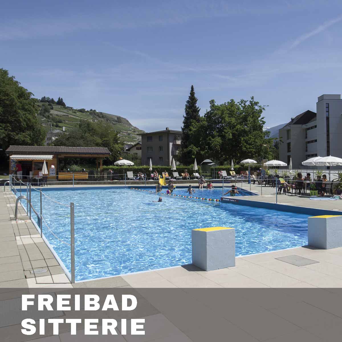 Das Freibad La Sitterie umfasst mehrere Becken, eine Erfrischungsbar und einen überdachten Bereich.