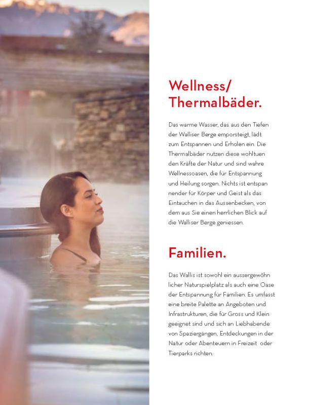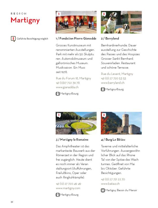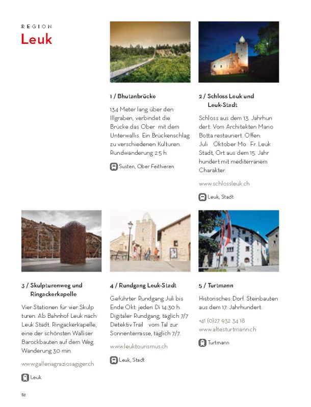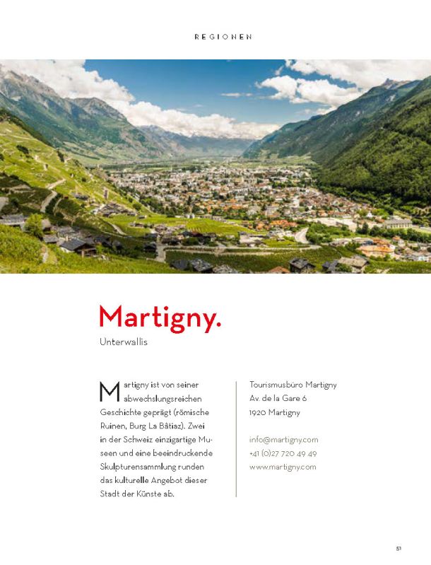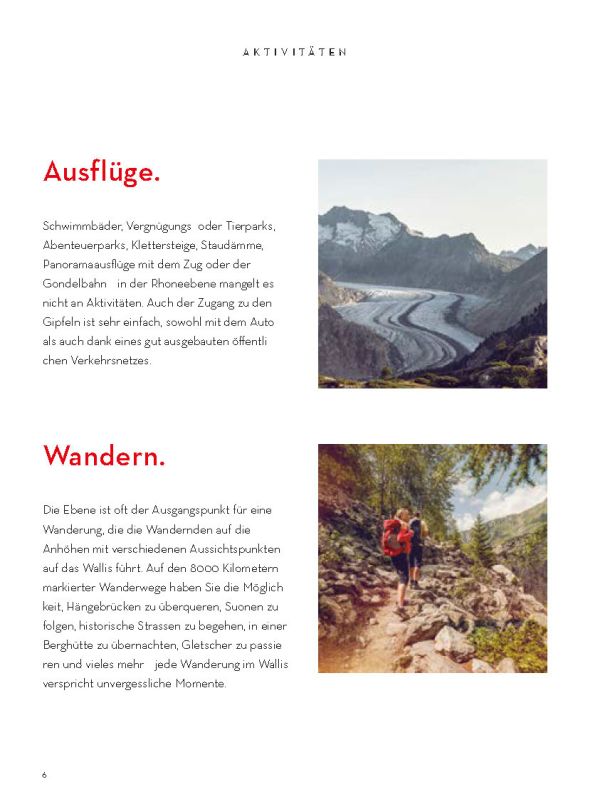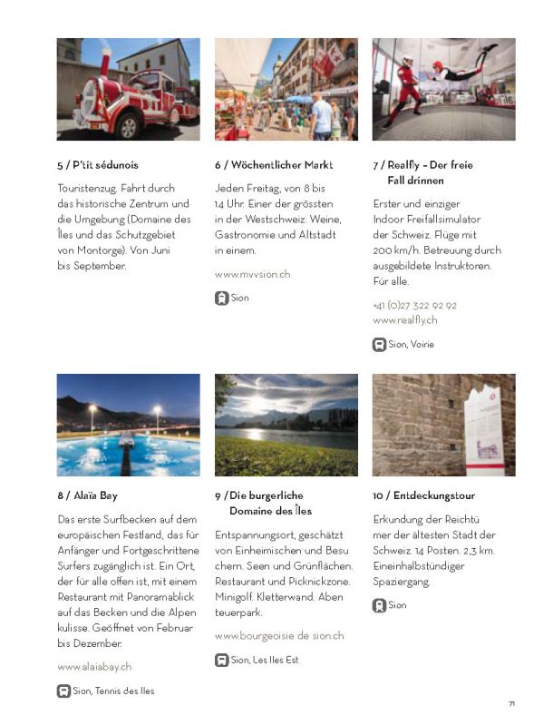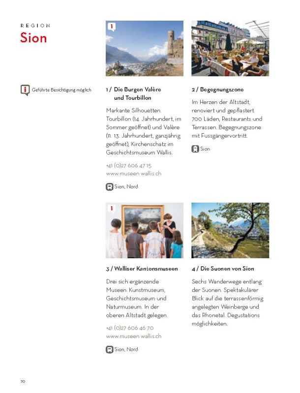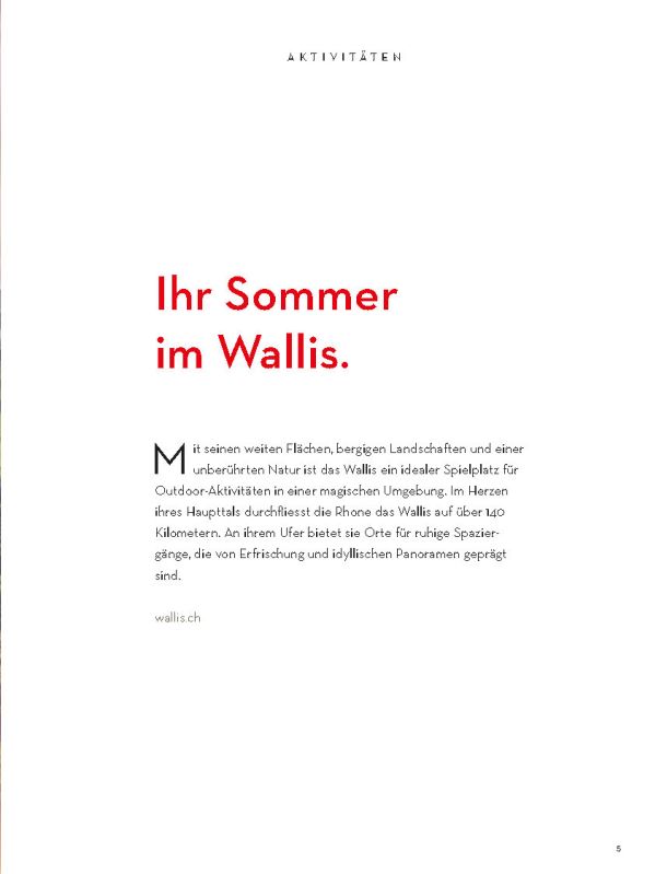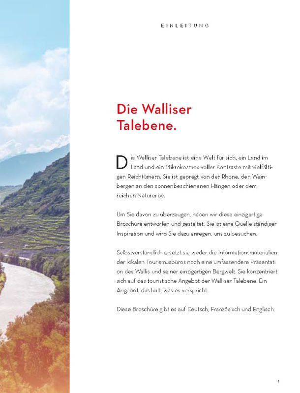 Selbstverständlich ersetzt sie weder die Informationsmaterialien der lokalen Tourismusbüros noch eine umfassendere Präsentation des Wallis und seiner einzigartigen Bergwelt. Sie konzentriert sich auf das touristische Angebot der Walliser Talebene. Ein Angebot, das hält, was es verspricht.