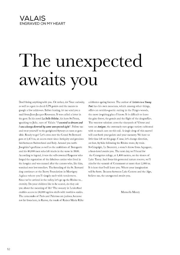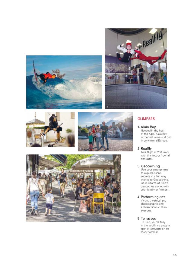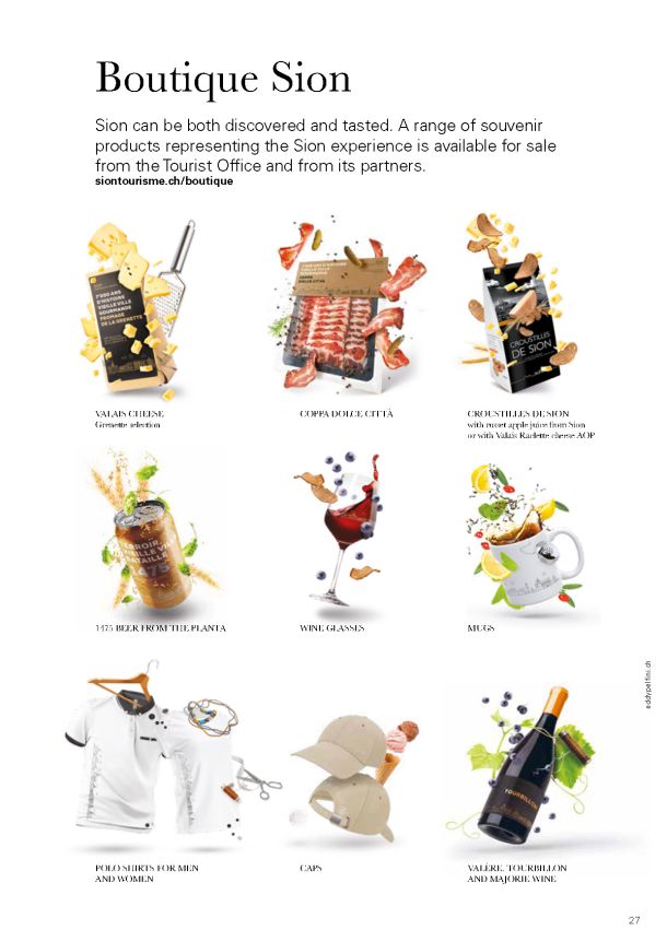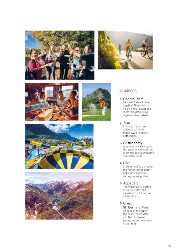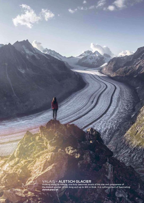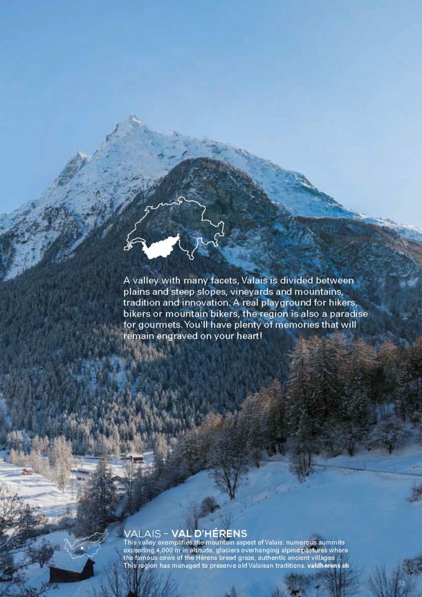 This brochure is a gift from the Tourist Office. We would like you to take our region home with you and share it with your friends and family. The professional photographs you will discover are our special favourites. Valais-born journalist and author Manuella Maury has been chosen to convey in just the right words the wonders of this holiday kingdom in which we wish you countless opportunities to experience wonderful emotions.